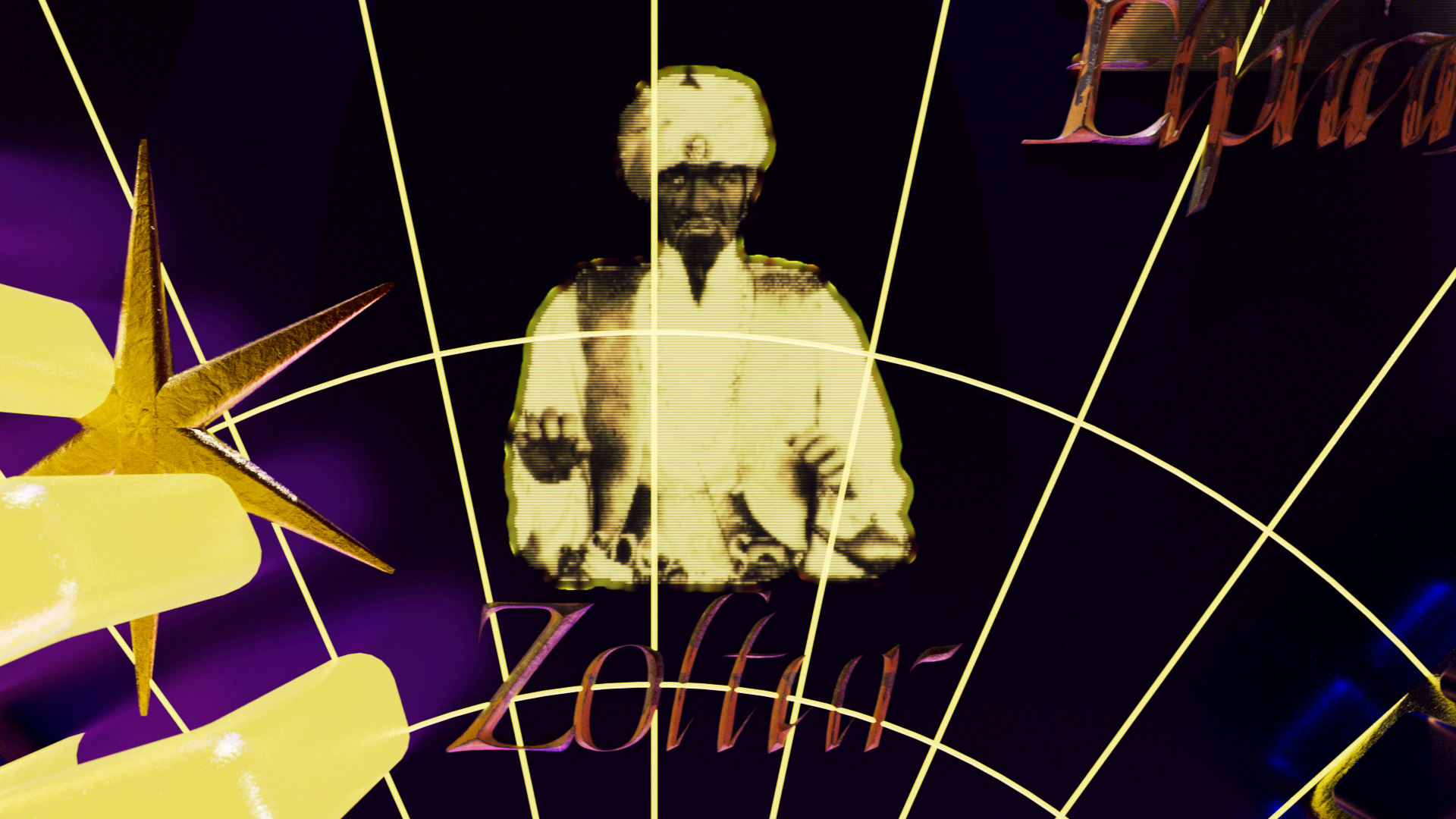 Enchanters, cosmic forms, and gilded type fuse with mechanical structures to make a machine of wizardry for your entertainment. Glowing lights flicker with power. An orb of sorcery traverses through the device. Its outcome depends on your skill. Do you dare to take on